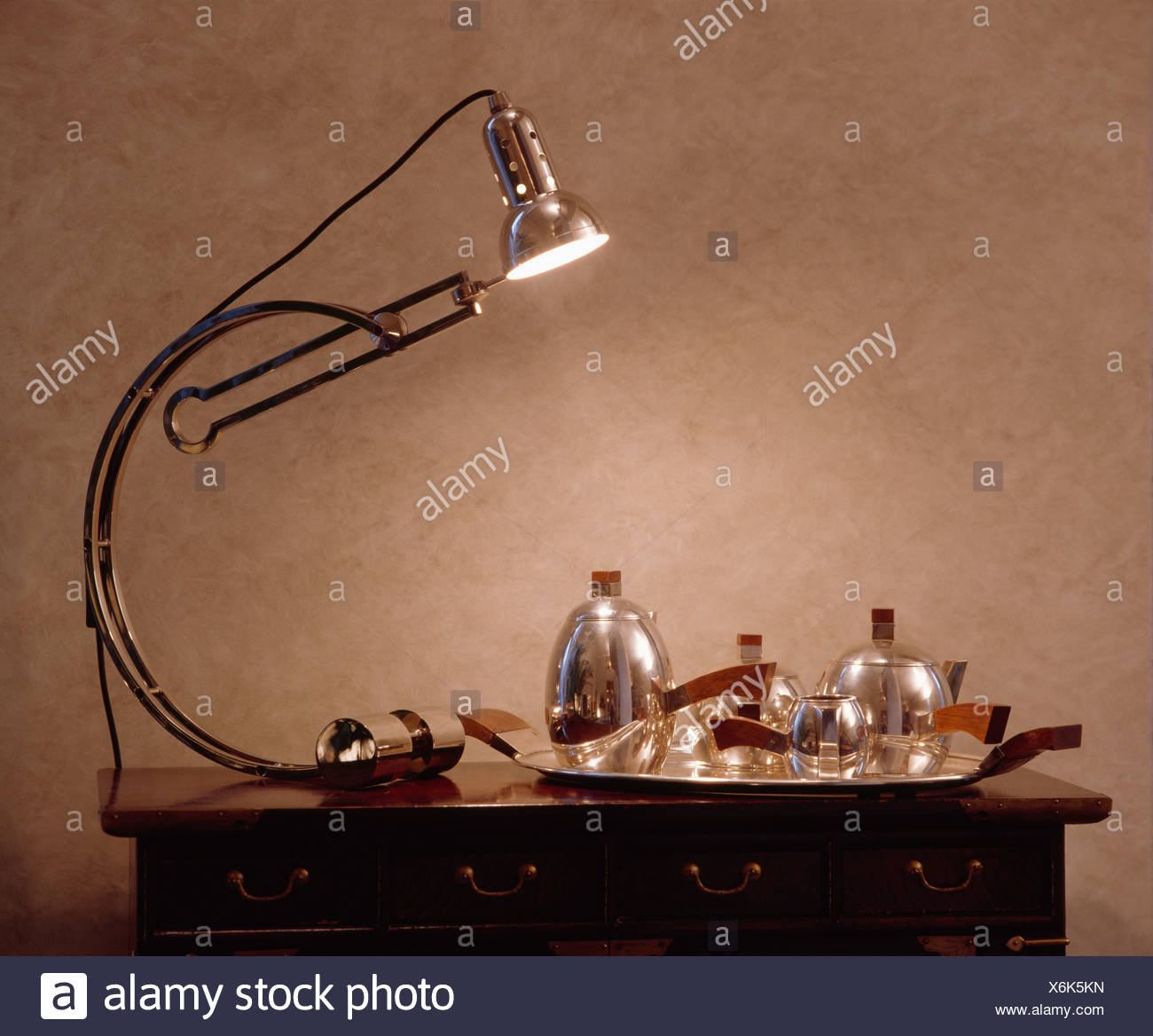 Close Up Of Chrome Lampe Art Deco Avec Cafetiere Et Theiere Chrome