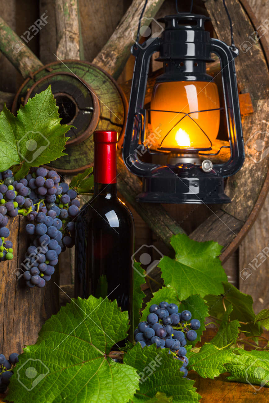 Bouteille De Vin Rouge Avec Des Raisins Sur Un Fond De Lampe Au