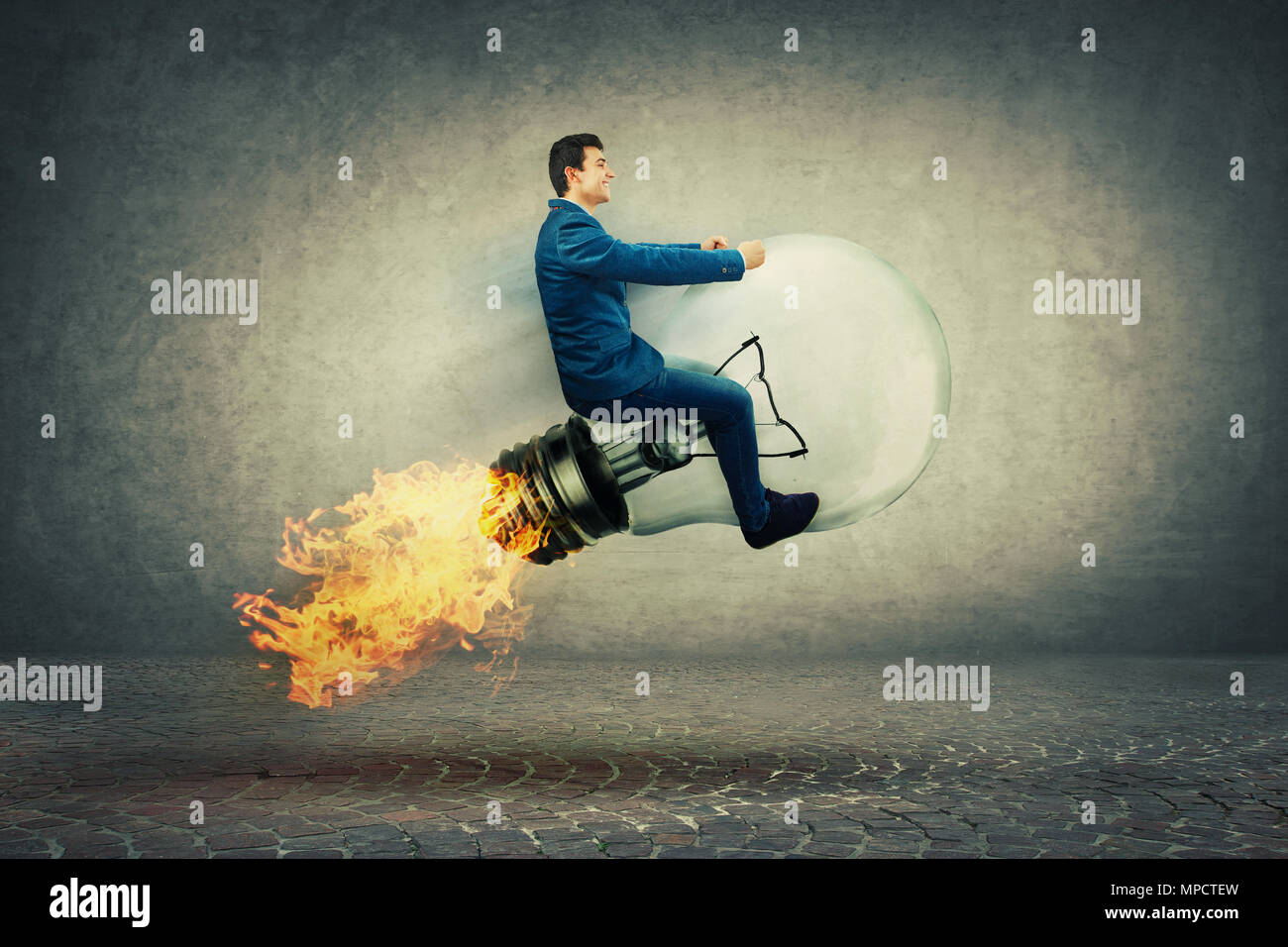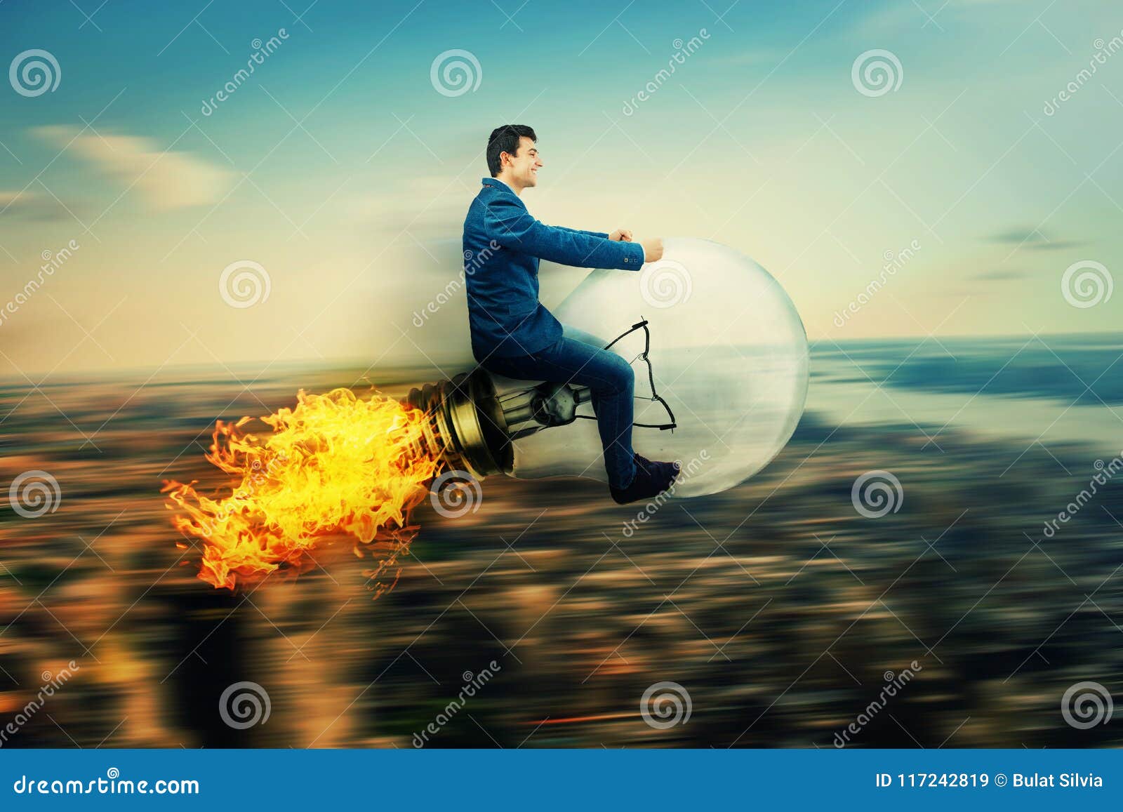 Cheerful Young Businessman Dur Sur Un Vol Rapide Fusee Ampoule