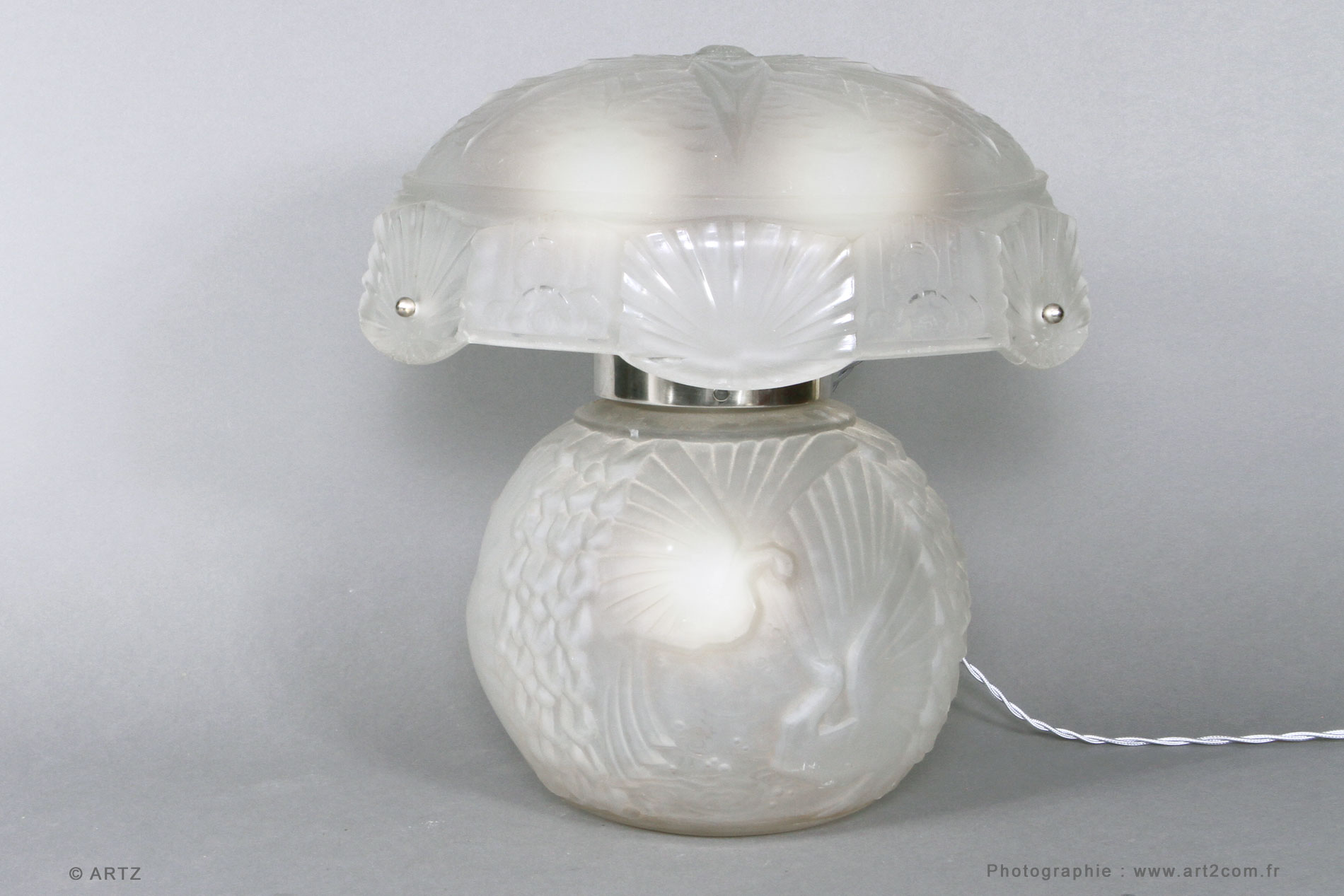 Lampe Globe Blanc Aux Paons Art Deco Muller Freres Brocante