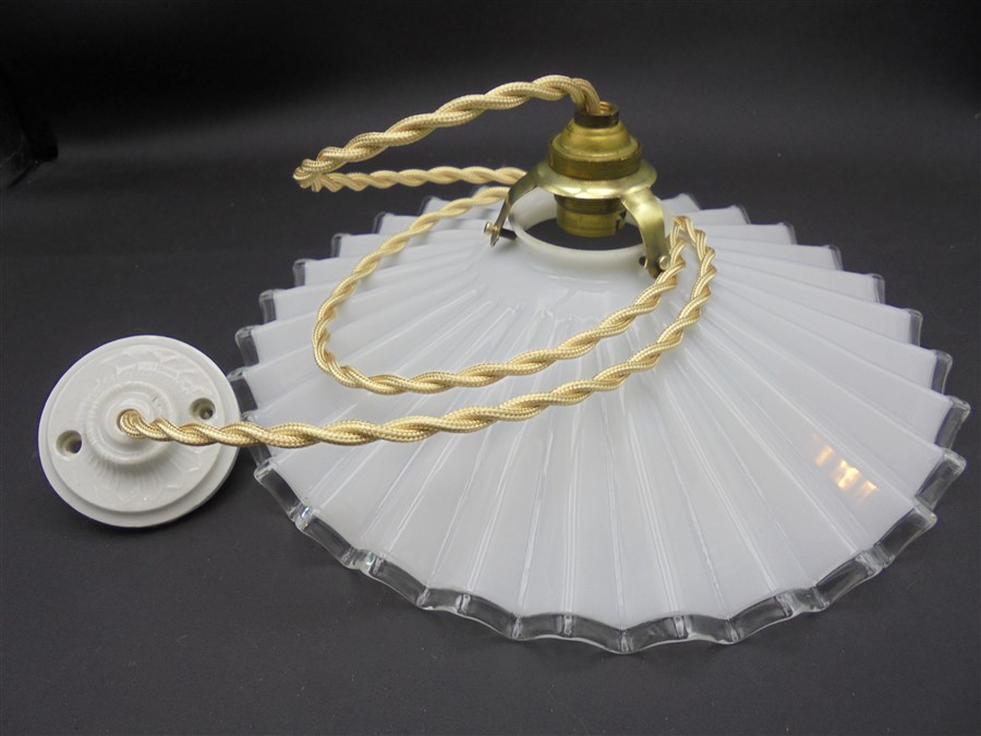 Lampe Suspension Ancien Abat Jour En Opaline Blanche Plissee Et